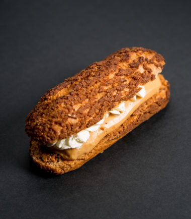 Composition : Fond croquant pralin, crème praliné, chantilly, pâte à choux craquelée.