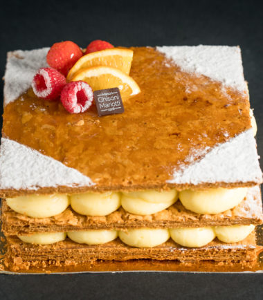 Composition : Pâte feuilletée au pure beurre, crème vanille et nappage caramel.